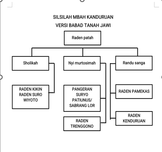 Seperti di awal kami sampaikan bahwa silsilah pertama berseumber dari Babad Tanah Jawi. Dalam sumber Babad Tanah Jawi di sebutkan bahwa Raden Patah sebagai Gelar Raja Islam Pertama, memiliki tiga orang istri. Istri ketiga dari Raden Patah adalah Randu Sanga yang memilik dua orang putra yakni; Raden Pamekas dan Raden Kanduruhan. Sebagimana peta bagan silsilah Raden Kanduruhan versi Babad Tanah Jawa.