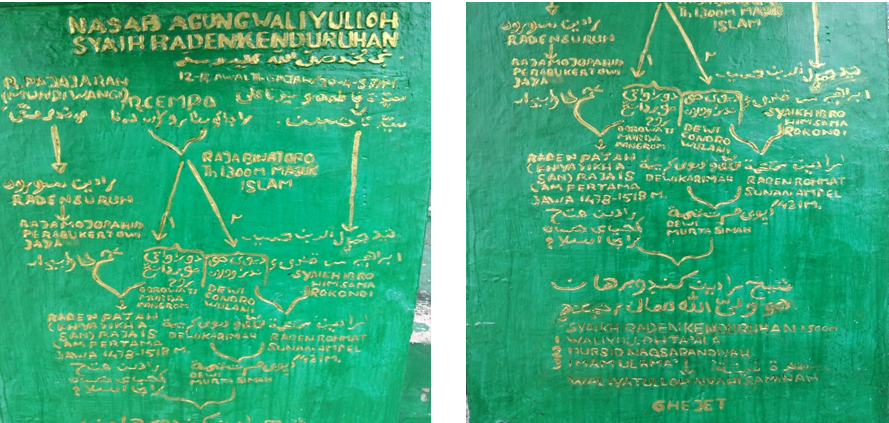 Silsilah dari istri kedua Sunan Ampel inilah yang tergurat di bagian atas dinding mengenai nasab Agung Raden Kanduruhan yang bertanggal angka 12 Rabiul Awal 20/4/571 M. Adapun silsilah yang tergurat di dinding tersebut yang mengambarkan dua generasi yang melahurkan Raden Kanduruhan. Pada sebelah kanan tertulis Ratu Cempo Raja Binatoro yang masuk Islam tahun 1300 M, turun ke Rorowati Murdiningrum dan Dewi Condrowulan. Dewi Condrowulan menikah dengan Syaikh Asy-Samarkhan atau lidah Jawa menyebut dengan “Asmorokondi” makam beliau di Tuban yang melahirkan Raden Rahmat terkenal dengan sebutan Sunan Ampel. Sunan Ampel menikah dengan Dewi Karimah dan melahirkan Dewi Murtasimah atau Asyiqah yang di nikahi Raden Patah. Pada sebelah kiri dinding gapura nasab Raden Kanduruhan tergurat paling atas nama R. Pajajaran Mundiwangi dan di bawahnya Raden Suruh kemudian “Raja Majapahit Prabu Kertowijaya” yang menikah dengan “Rorowati Murdianingrum”, dari pernikahan tersebut lahirlah “Raden Patah” pada dinding bertuliskan Gelar Raja Islam Pertama Jawa 1478-1518 M yang merupakan ayah dari “Raden Kanduruhan”