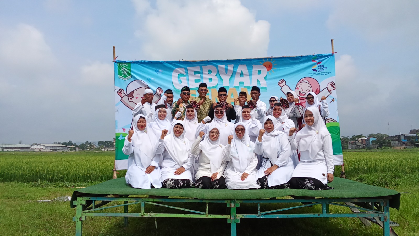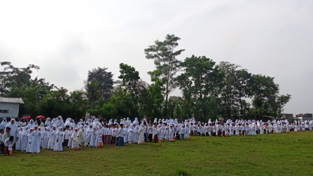 Para peserta tampak kompak mengenakan busana ala santri bersarung dan berpakaian muslim-muslimah putih yang menjadi simbol kesucian dalam menuntut ilmu. Dengan penuh semangat, mereka mengikuti setiap gerakan senam yang dipandu instruktur di tengah suasana cerah pagi hari.