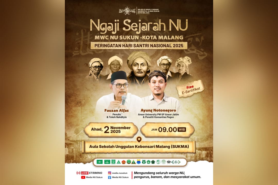 numalang.id — Menjelang peringatan Hari Santri Nasional 2025, Majelis Wakil Cabang Nahdlatul Ulama (MWCNU) Sukun, Kota Malang, bersiap menggelar kegiatan Ngaji Sejarah NU (Jirah 2025) pada Minggu, (2/11/25), pukul 09.00 WIB di Aula Sekolah Unggulan Kebonsari Malang (SUKMA).