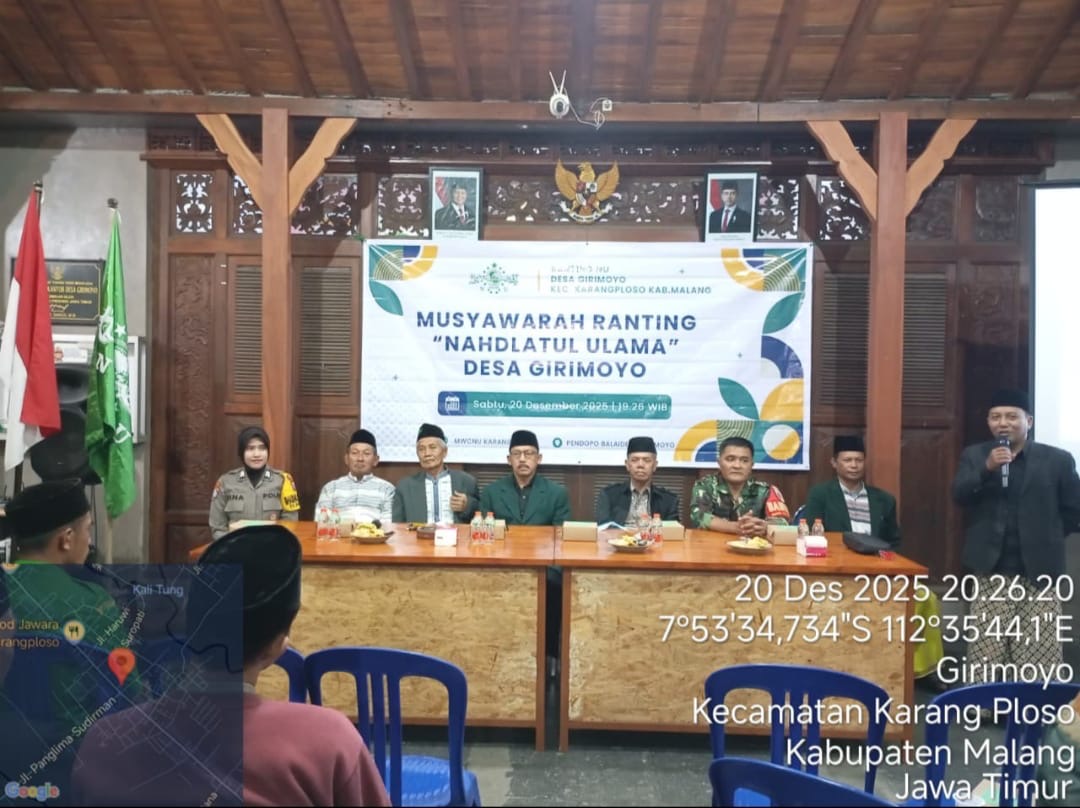 Karangploso – Musyawarah Ranting Nahdlatul Ulama (Mursyiran) Desa Girimoyo, Kecamatan Karangploso, Kabupaten Malang, resmi menetapkan nahkoda baru untuk masa khidmat 2025-2030. Dalam sidang pleno yang berlangsung khidmat, Bapak Abdul Rokhim terpilih sebagai Ketua Tanfidiyah, sementara posisi strategis Rois Syuriah diamanahkan kepada Abah H. Soedarno melalui mekanisme Ahlul Halli wal Aqdi (AHWA).